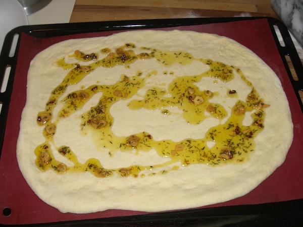 Dann ist es soweit: Den Pizzateig auf einem eingefetteten Blech - oder so wie ich auf Backpapier/einer Backmatte ausrollen und ein wenig von dem Knoblauch/Gewürzöl darüber träufeln.